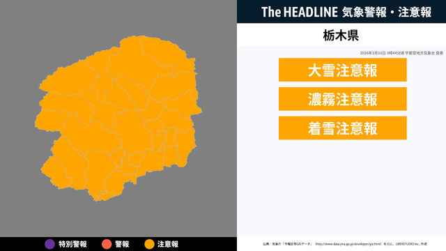 3月10日3時44分頃、栃木県の大雪注意報・濃霧注意報などが更新