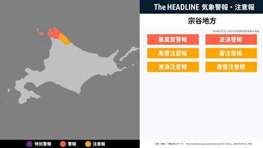 1月7日21時29分頃、宗谷地方に暴風雪警報・波浪警報などが発表