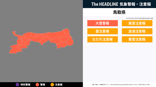 2月8日3時57分頃、鳥取県の大雪警報・風雪注意報などが更新