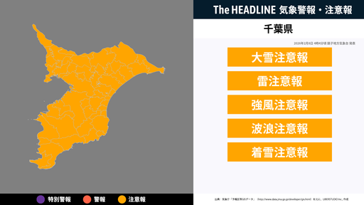2月8日4時4分頃、千葉県の大雪注意報・雷注意報などが更新