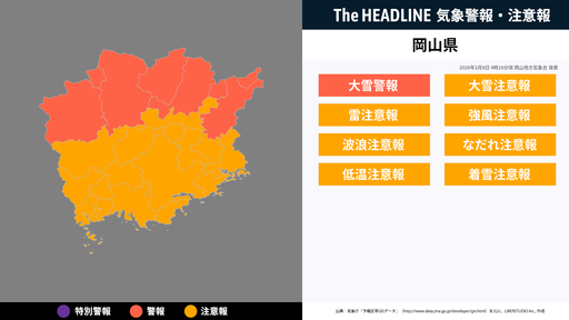 2月8日4時16分頃、岡山県に大雪警報・大雪注意報などが発表