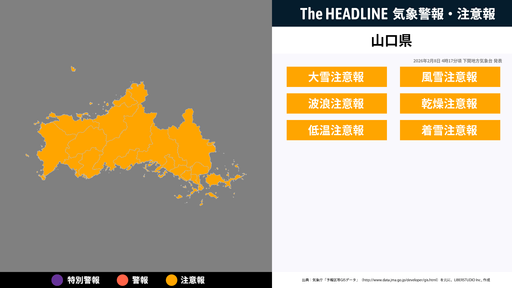 2月8日4時17分頃、山口県の大雪注意報・風雪注意報などが更新