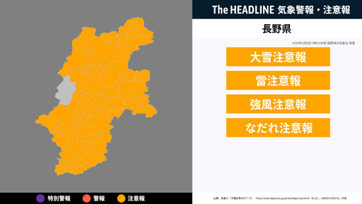 2月8日4時12分頃、長野県に大雪注意報・雷注意報などが発表