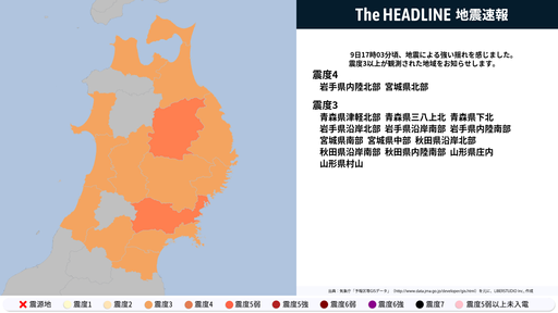 11月9日17時3分頃、岩手県・宮城県などで震度3以上の地震を観測