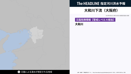 大和川上流(奈良県)が氾濫危険水位に到達して、氾濫する危険性