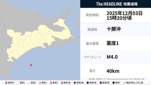 12月3日15時20分頃、北海道で最大震度1の地震を観測