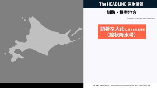 釧路地方、線状降水帯による非常に激しい雨が続き災害発生の危険度が急激に高まる