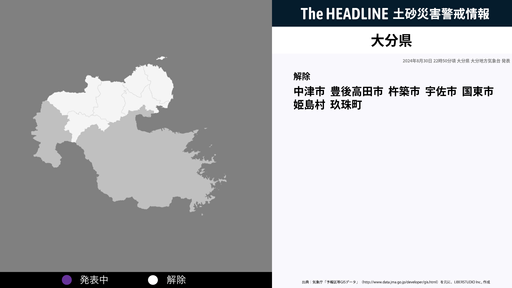 8月30日22時50分、大分県の土砂災害警戒情報が解除された