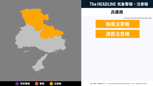 10月18日1時51分頃、兵庫県に強風注意報・濃霧注意報が発表