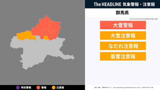 12月4日6時35分頃、群馬県の大雪警報・大雪注意報などが更新