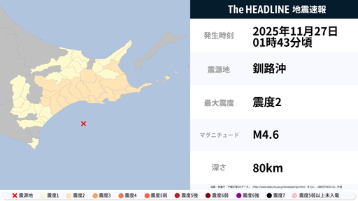 11月27日1時44分頃、北海道で最大震度2の地震を観測