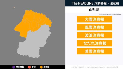 1月3日17時10分頃、山形県に大雪注意報・風雪注意報などが発表