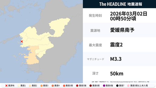 3月2日0時50分頃、愛媛県で最大震度2の地震を観測