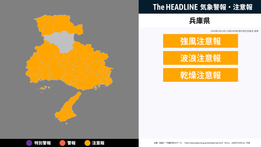 1月12日21時14分頃、兵庫県に強風注意報・波浪注意報などが発表