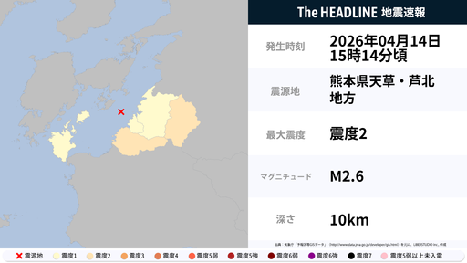 4月14日15時14分頃、熊本県で最大震度2の地震を観測