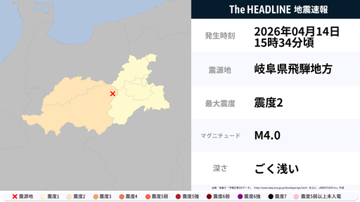 4月14日15時34分頃、岐阜県で最大震度2の地震を観測