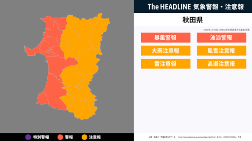 1月13日13時22分頃、秋田県の暴風警報・波浪警報などが更新