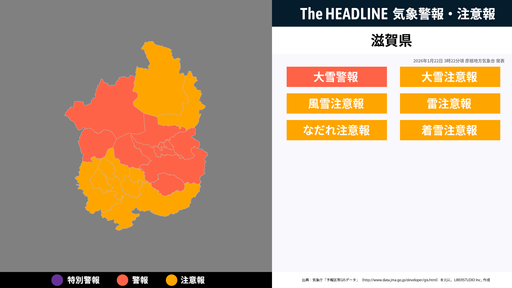 1月22日3時22分頃、滋賀県に大雪警報・大雪注意報などが発表