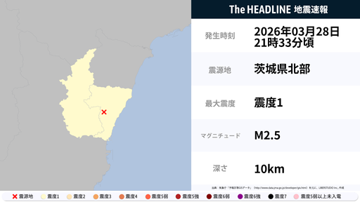 3月28日21時33分頃、茨城県で最大震度1の地震を観測