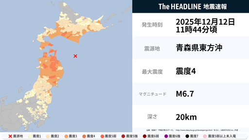 12月12日11時44分頃、北海道・青森県などで最大震度4の地震を観測