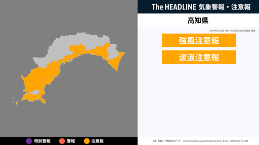 3月26日4時17分頃、高知県の強風注意報・波浪注意報が更新