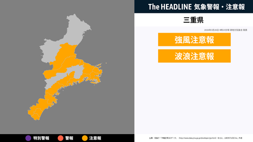 3月26日4時23分頃、三重県の強風注意報・波浪注意報が更新