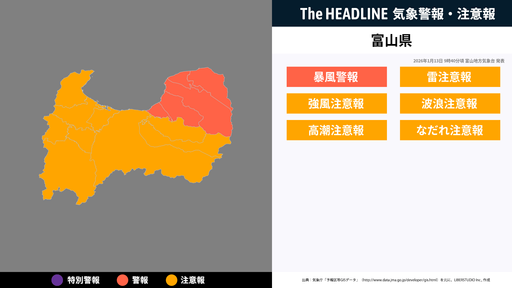 1月13日9時40分頃、富山県の暴風警報・雷注意報などが更新
