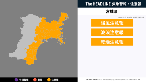 1月13日9時52分頃、宮城県の強風注意報・波浪注意報などが更新