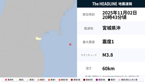11月2日20時43分頃、宮城県で最大震度1の地震を観測