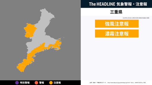 11月2日23時29分頃、三重県に強風注意報・濃霧注意報が発表