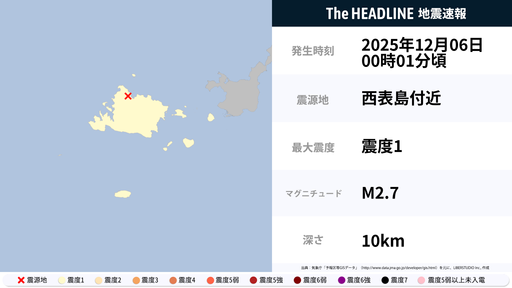 12月6日0時1分頃、沖縄県で最大震度1の地震を観測