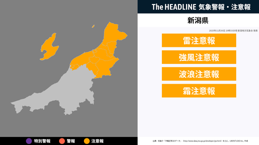 11月30日20時33分頃、新潟県の雷注意報・強風注意報などが更新