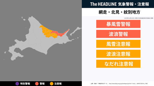 12月15日15時47分頃、網走・北見・紋別地方の暴風雪警報・波浪警報などが更新