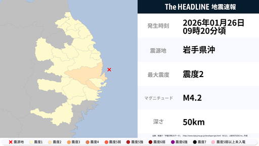 1月26日9時20分頃、岩手県で最大震度2の地震を観測
