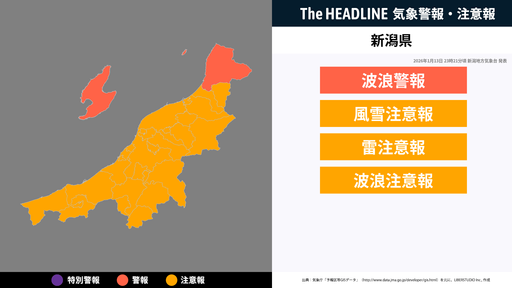 1月13日23時21分頃、新潟県に波浪警報・風雪注意報などが発表