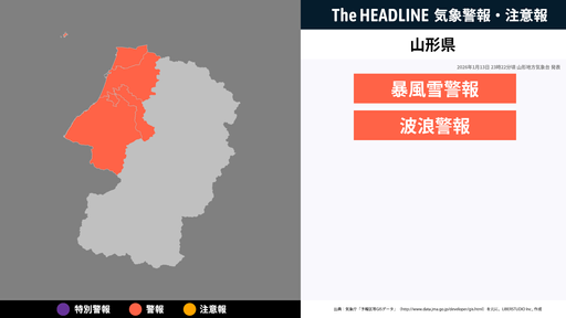 1月13日23時22分頃、山形県に暴風雪警報・波浪警報が発表