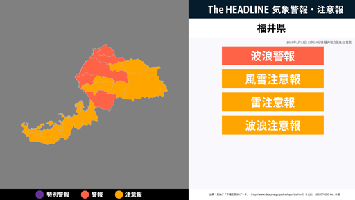 1月13日23時24分頃、福井県に波浪警報・風雪注意報などが発表