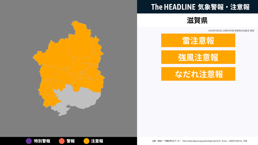 3月6日22時50分頃、滋賀県の雷注意報・強風注意報などが更新