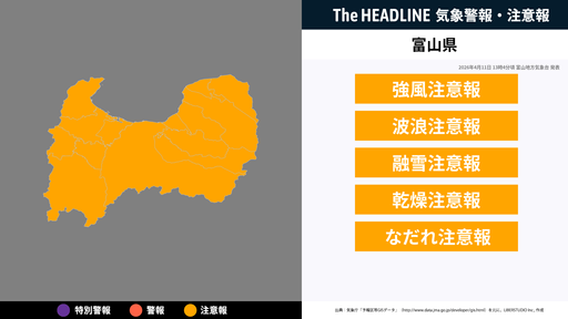 4月11日13時4分頃、富山県の強風注意報・波浪注意報などが更新