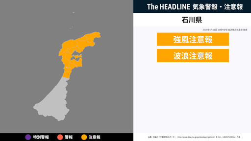 4月11日13時4分頃、石川県の強風注意報・波浪注意報が更新