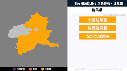 1月26日0時45分頃、群馬県の大雪注意報・乾燥注意報などが更新