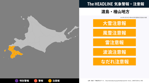 1月26日0時44分頃、渡島地方・檜山地方の大雪注意報・風雪注意報などが更新