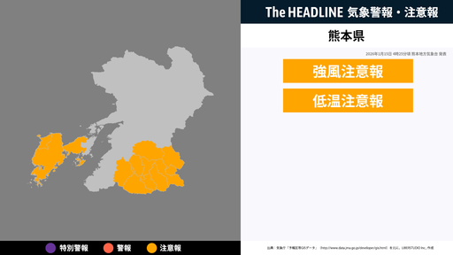 1月15日4時25分頃、熊本県に強風注意報・低温注意報が発表