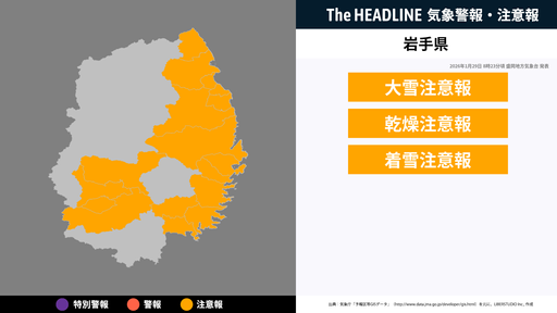 1月29日8時23分頃、岩手県に大雪注意報・乾燥注意報などが発表