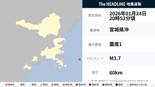1月24日20時52分頃、岩手県・宮城県で最大震度1の地震を観測