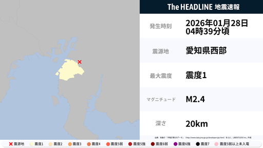 1月28日4時40分頃、愛知県で最大震度1の地震を観測
