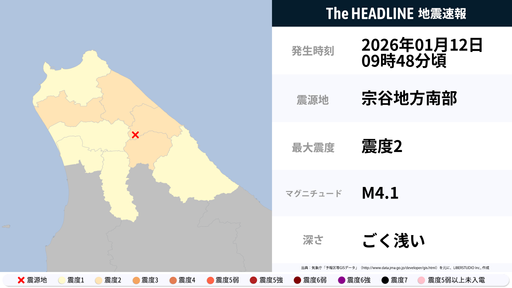 1月12日9時48分頃、北海道で最大震度2の地震を観測