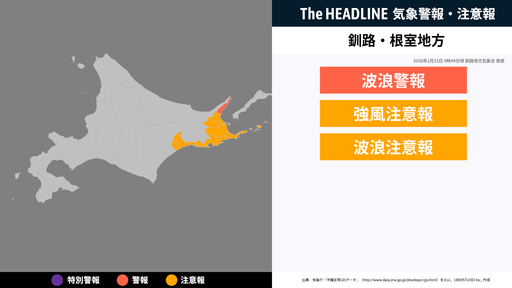 1月12日9時44分頃、根室地方・釧路地方に波浪警報・強風注意報などが発表