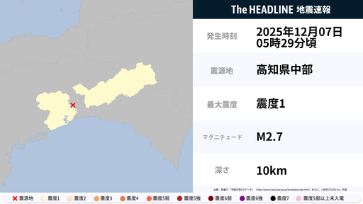 12月7日5時30分頃、高知県で最大震度1の地震を観測