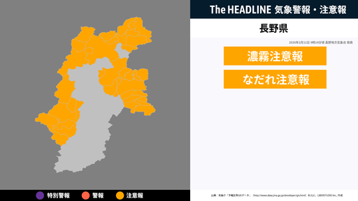 2月11日9時14分頃、長野県に濃霧注意報・なだれ注意報が発表